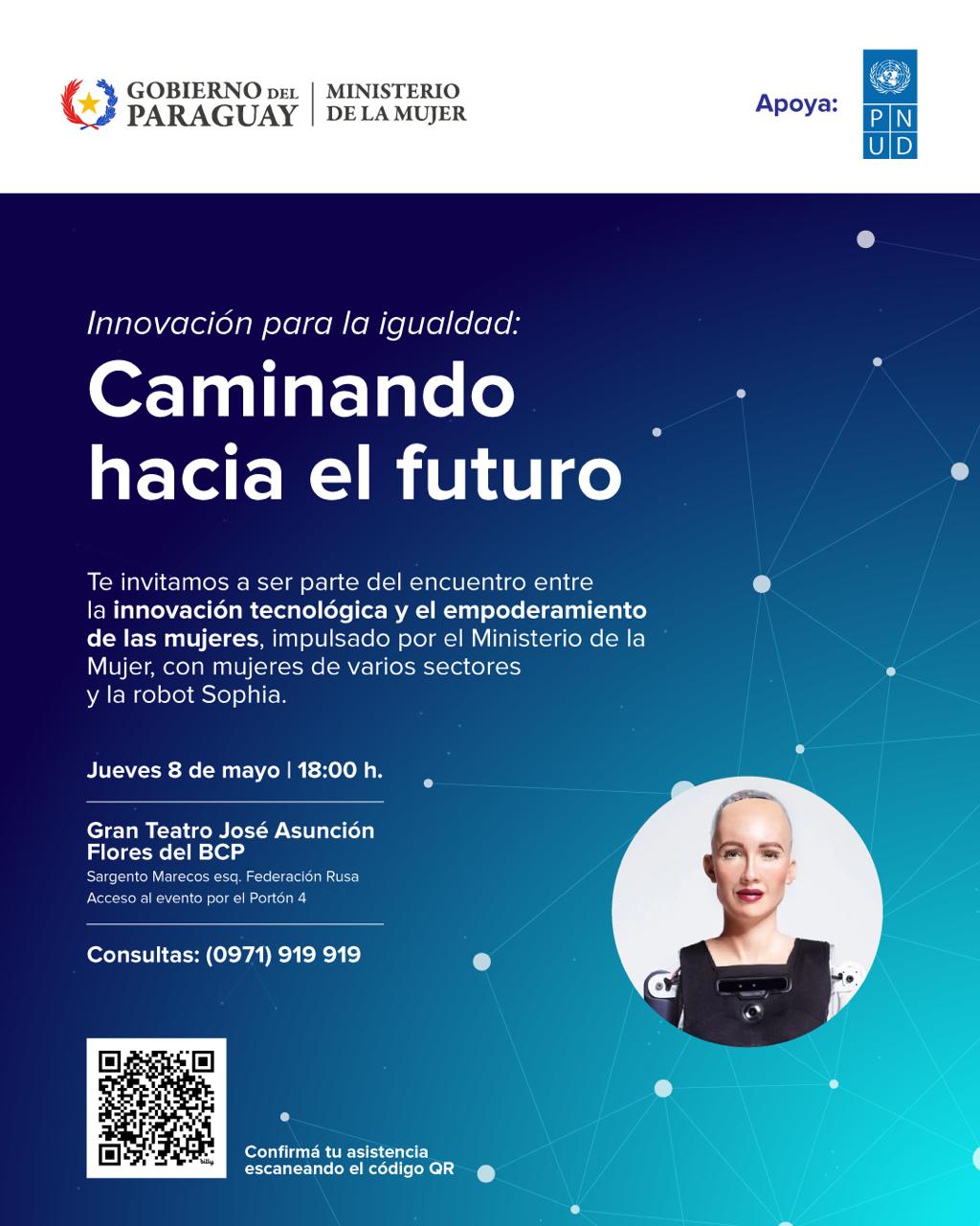 El Ministerio de Tecnologías de la Información y Comunicación (MITIC), desde su posición de entidad rectora en temas relacionados con la tecnología, brinda su apoyo a esta actividad y se espera la participación de sus autoridades, como la de Cinthia Facciuto, directora general de Innovación Productiva y Economía Digital, quien tendrá un momento de interacción con Sophia.