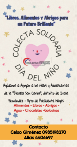 Ayúdanos a través de transferencia a la Cuenta 14-1941703 – Banco Familiar, a nombre de Rocio Barrios 4406697. Para mayores datos contactar con Celso Gimenez Cel. 0985198270. La Red Activa Paraguay espera seguir contando con el apoyo de la comunidad para futuras iniciativas solidarias.
