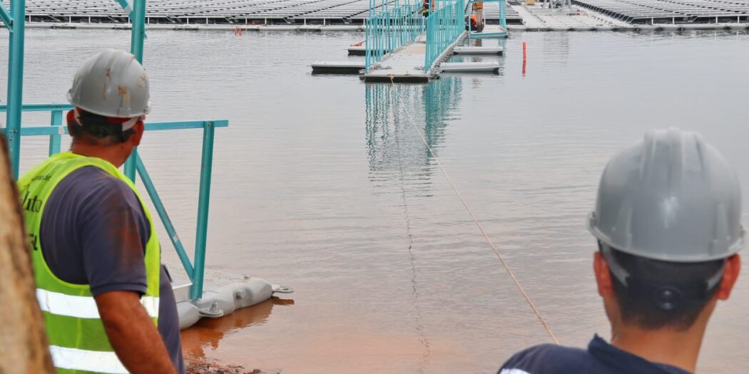 La construcción de la primera Planta Solar Flotante (PSF) de Paraguay, impulsada por Itaipú Binacional, continúa avanzando a buen ritmo. Esta semana se completó el montaje de la pasarela de acceso y de los ductos eléctricos que conectan la planta con el Puesto de Distribución, asegurando la unión entre la estructura flotante y la costa del embalse de la Central Hidroeléctrica.