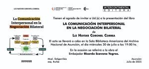 El próximo miércoles 30 de julio, en la sala Biblioteca Américana del Archivo Nacional de Asunción (Mcal. Estigarribia esquina Iturbe), a las 19 horas, se realizará la presentación del libro “La Comunicación Interpersonal en la Negociación Bilateral”, de la embajadora Liz Haydee Coronel Corea. La presentación estará a cargo del reconocido historiador y diplomático paraguayo, embajador Ricardo Scavone.