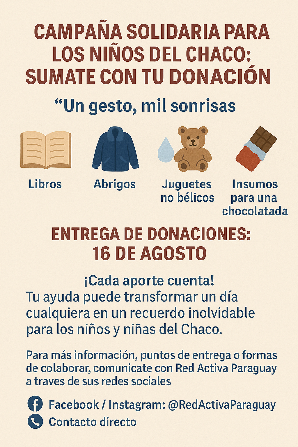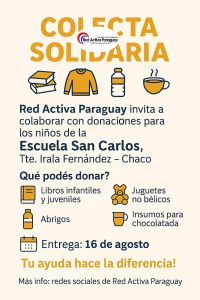 En una muestra de compromiso social, la Asociación de Comunicadores Red Activa Paraguay lanzó una campaña solidaria con el objetivo de reunir donaciones destinadas a los niños de la Escuela San Carlos, ubicada en la localidad de Tte. Irala Fernández, en pleno corazón del Chaco paraguayo.
